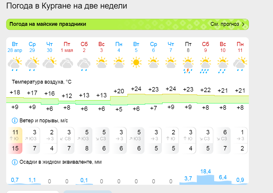 Синоптики представили несколько прогнозов погоды на 9 мая в Кургане. День обещает быть тёплым, однако не исключены дожди.