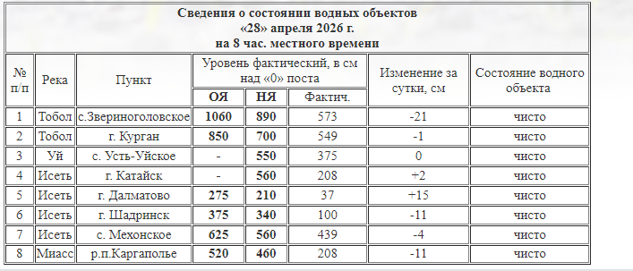 В селе Звериноголовское уровень Тобола опустился ниже 6 метров — до 573 см. За сутки вода убыла на 21 см. В реке Исеть ситуация различается: в Далматово и Катайске уровень продолжает расти, а в Шадринске и селе Мехонское — снижается.