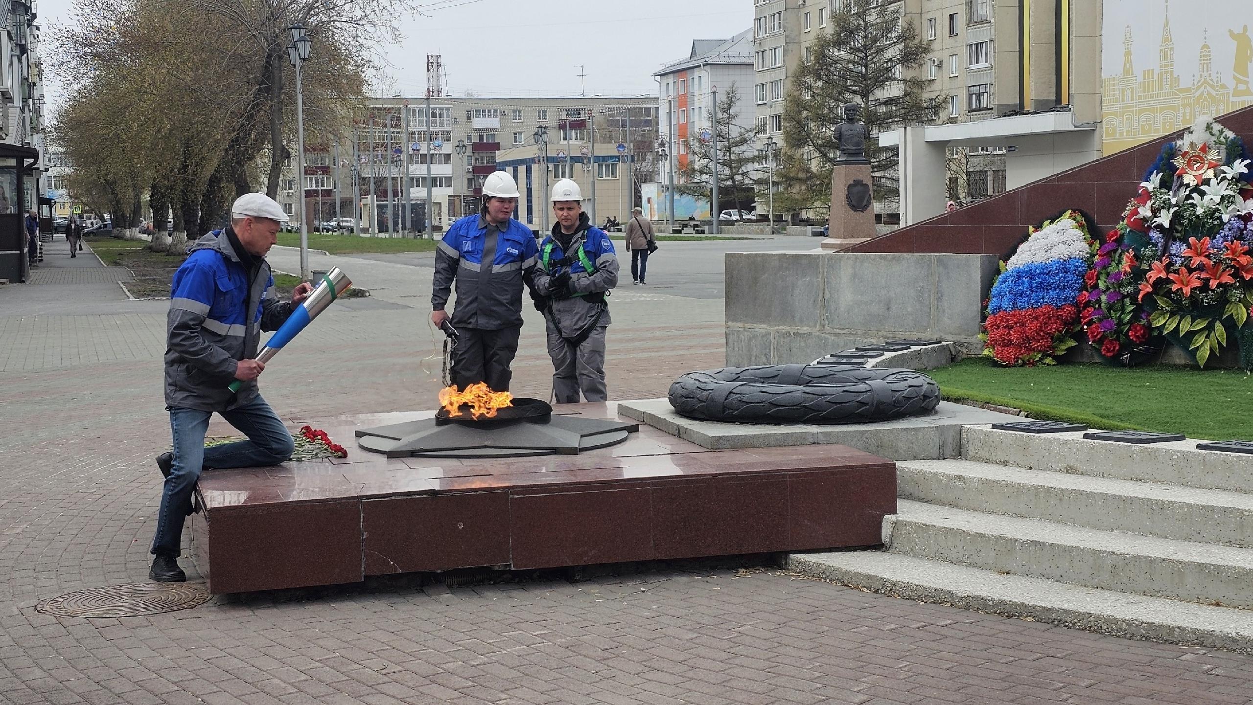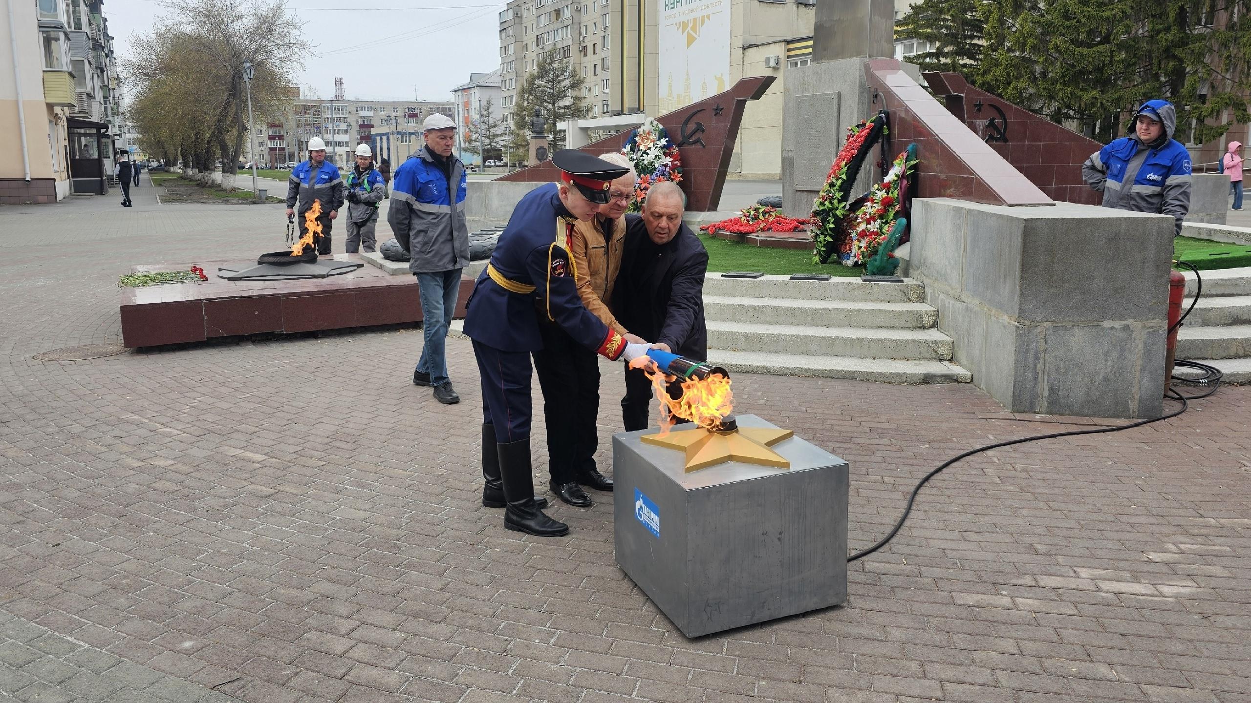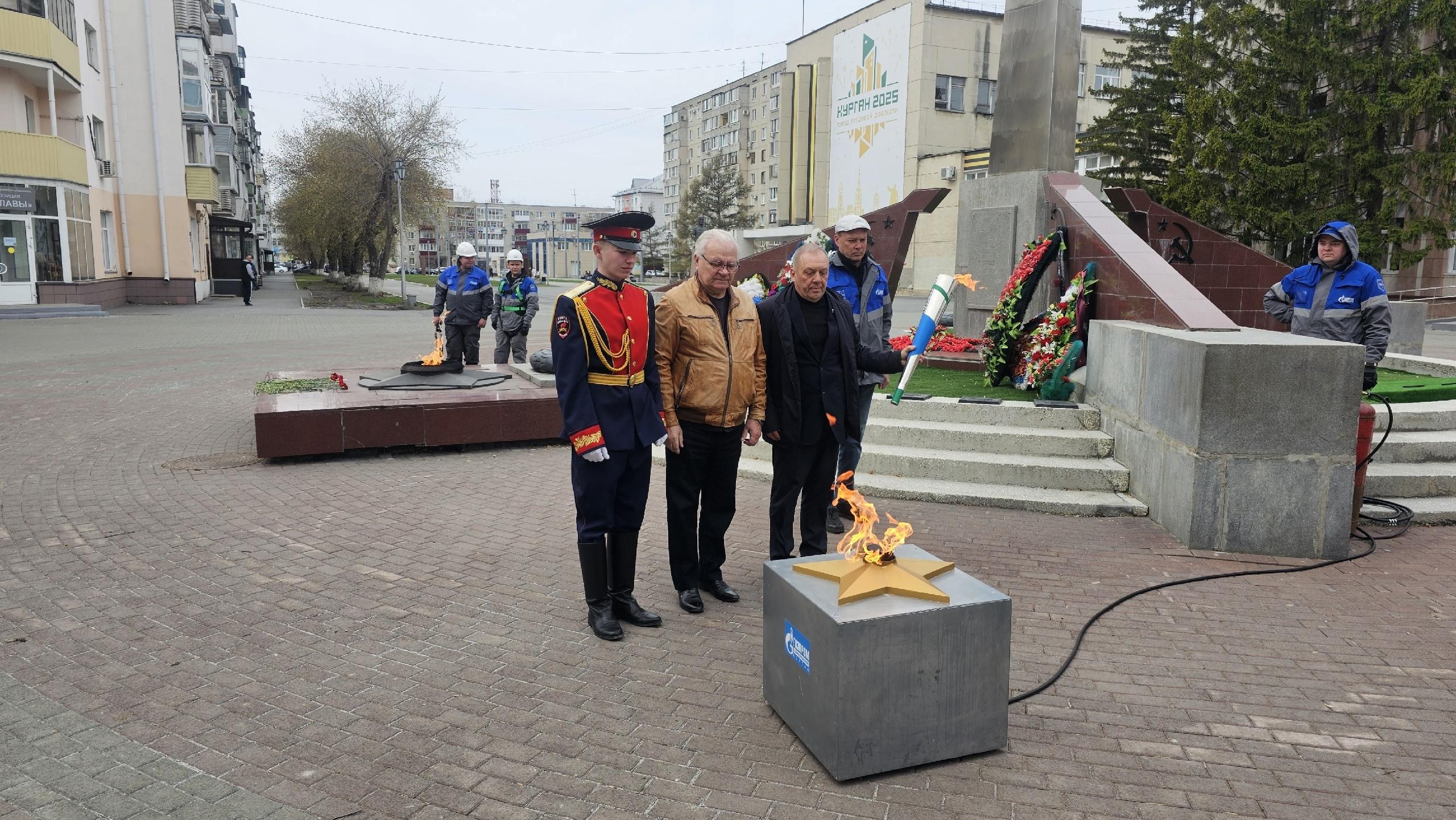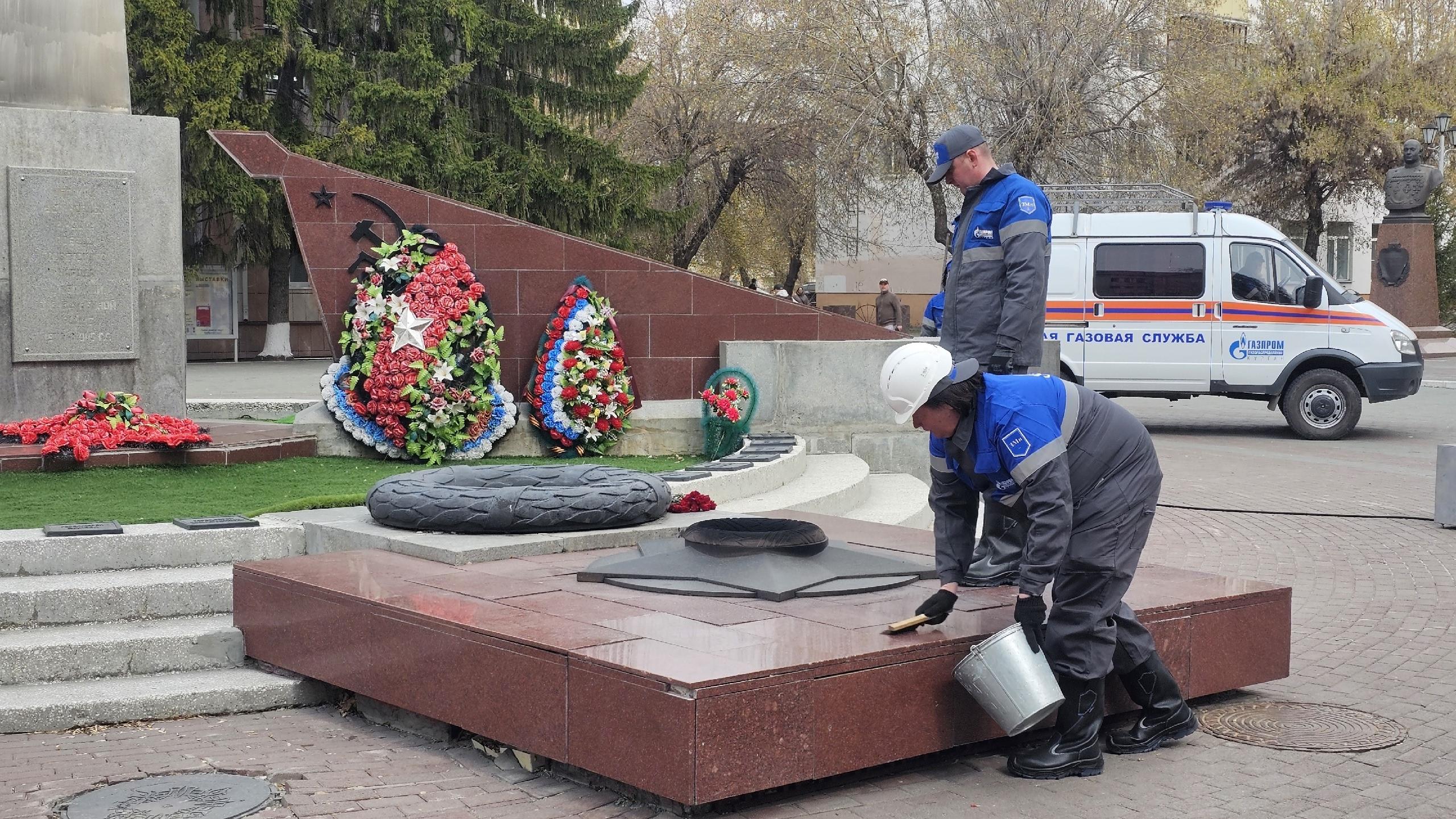 Подготовка Вечного огня в Кургане к празднованию Дня Победы