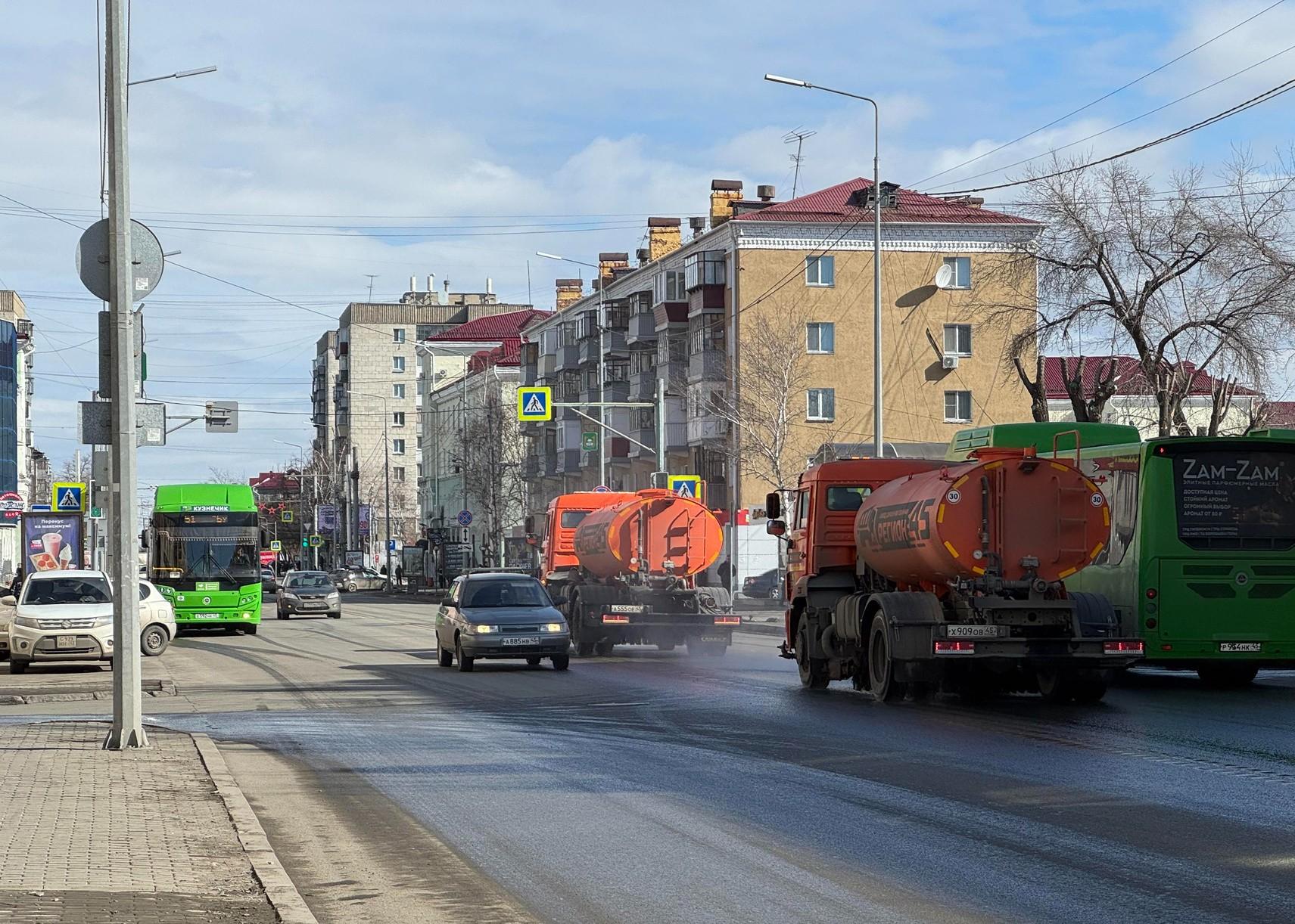 Поливочные машины работали на улицах города в марте, что способствовало общей очистке.