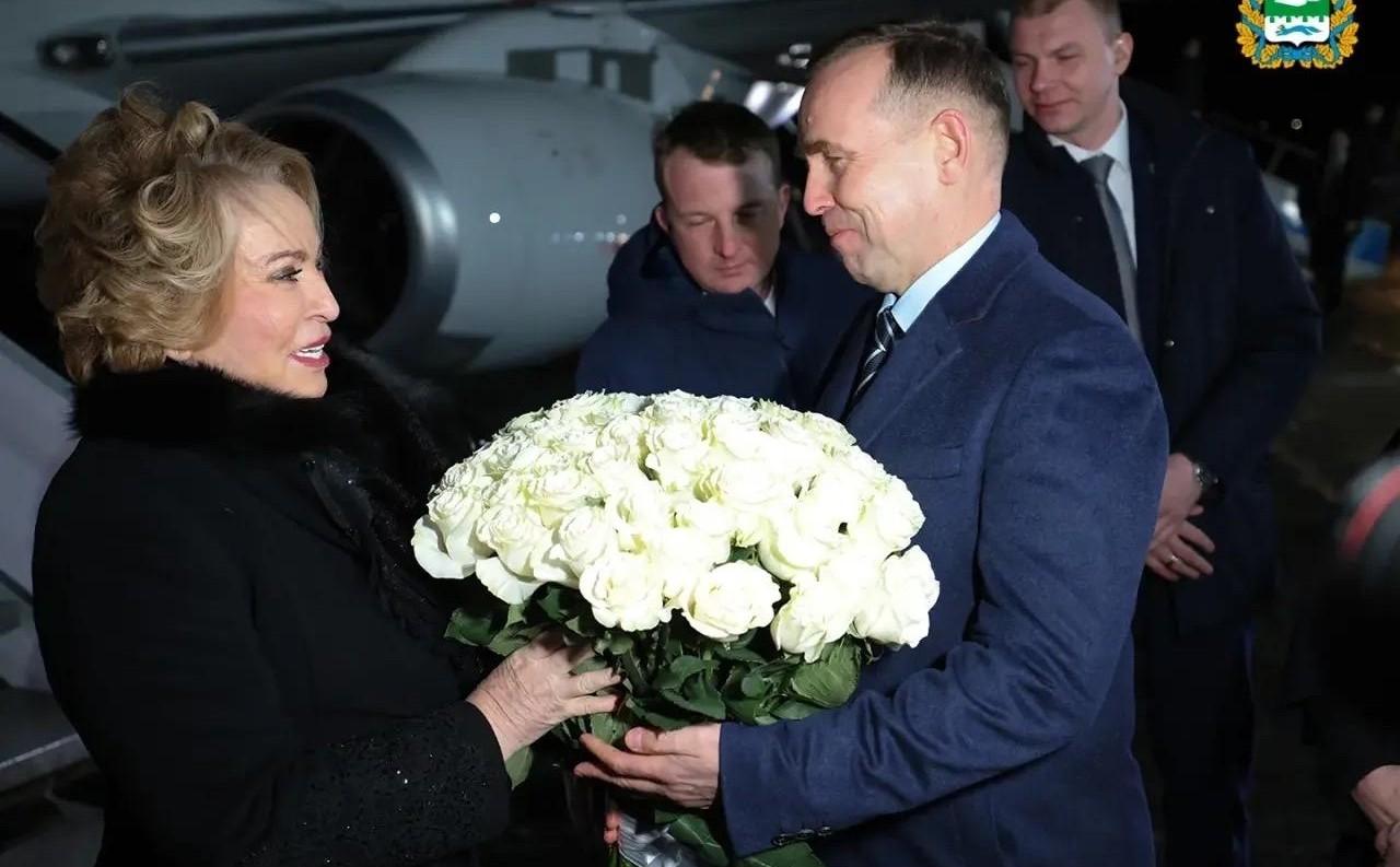Губернатор Вадим Шумков вручил Валентине Матвиенко букет из белых роз при встрече в аэропорту.