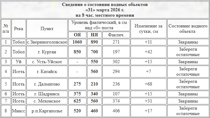 Утром 31 марта уровень Тобола в районе Кургана достиг 197 сантиметров, всего за сутки поднявшись на 42 см и приблизившись к двухметровой отметке.