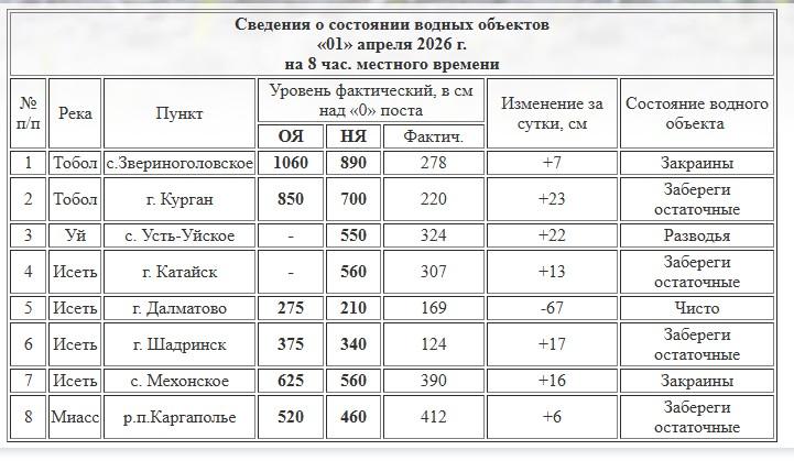 В других населённых пунктах области также зафиксирован рост: в Звериноголовском прибавка составила 7 см (уровень 278 см), в Шадринске на Исети — 17 см, в Катайске — 13 см, в селе Мехонское — 16 см. При этом в Далматово уровень воды, напротив, снизился на 67 сантиметров.