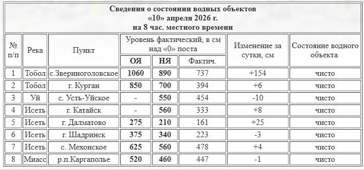 По данным Курганского ЦГМС, утром в Кургане уровень Тобола поднялся до 394 сантиметров, увеличившись за сутки на 6 сантиметров. В селе Звериноголовское за тот же период вода прибавила 154 сантиметра, достигнув к 8:00 отметки в 737 сантиметров.