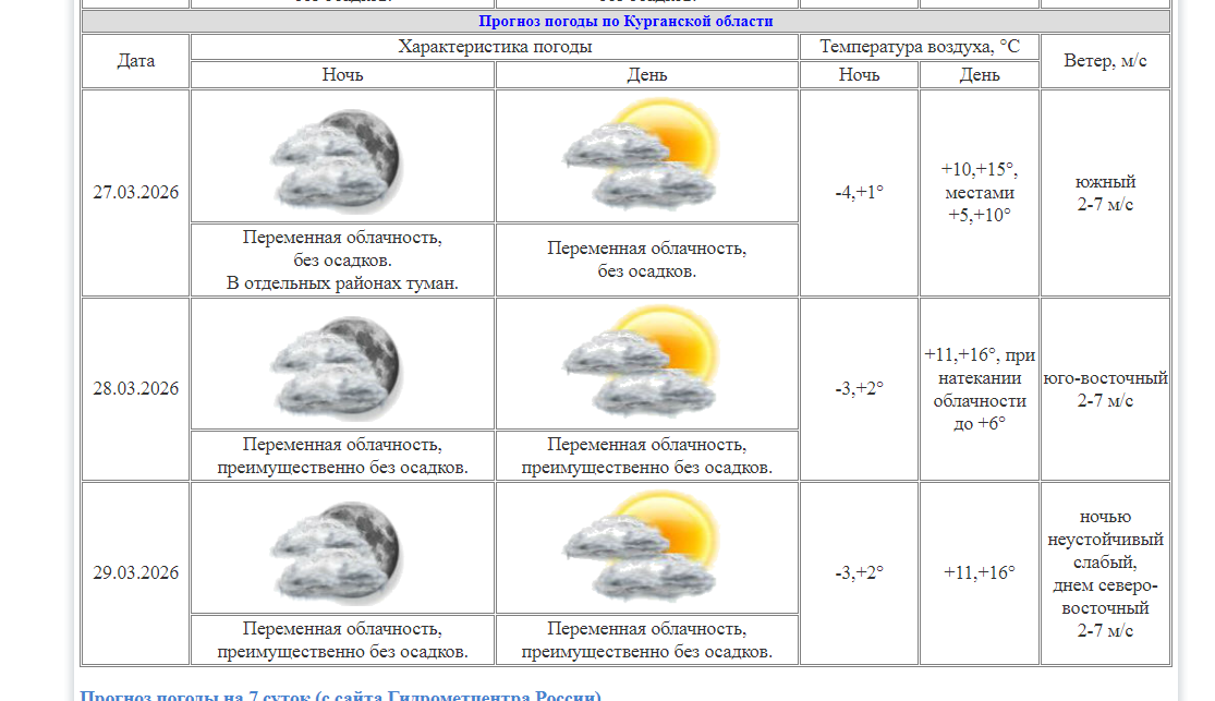 Специалисты Курганского центра по гидрометеорологии и мониторингу окружающей среды сообщают, что в субботу, 28 марта, дневная температура составит от +11 до +16 градусов. При увеличении облачности столбик термометра опустится до +6°. В воскресенье ожидается аналогичный диапазон: +11...+16°. Ночью температура останется отрицательной или близкой к нулю: от -3 до +2°.