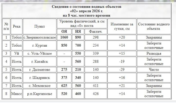 В селе Звериноголовском прирост уровня Тобола достиг 20 сантиметров. На реке Исеть ситуация неоднородна: в Шадринске вода поднялась на 16 см, в Мехонском — на 21 см, тогда как в Катайске уровень снизился на 19 сантиметров, а в Далматово — на 29 сантиметров.