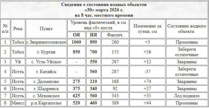 Показатели уровня воды в реках Зауралья на 8:00 30 марта