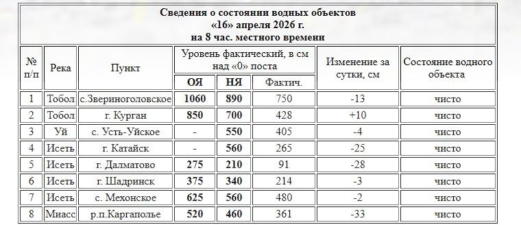 В селе Звериноголовское, расположенном также на Тоболе, ситуация развивается в противоположном направлении. Здесь уровень реки за последние 24 часа снизился на 13 сантиметров, достигнув отметки 750 см. Гидрологи отмечают, что пик половодья в Звериноголовском был пройден 12 апреля, и с тех пор вода постепенно убывает. Аналогичная тенденция к снижению наблюдается и в других реках Курганской области: Исети, Уе и Миассе.