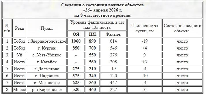 В Катайске река Исеть прибавила 3 сантиметра. В Шадринске, напротив, зафиксировано падение на 10 сантиметров. В Далматово и селе Мехонское уровень упал на 4 сантиметра.