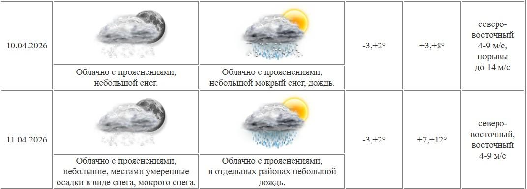 Температура воздуха в ночные часы составит от -3 до +2 градусов. Днем столбики термометров поднимутся до отметок от +3 до +8 градусов. Ветер будет дуть с северо-востока со скоростью 4-9 метров в секунду, порывы могут достигать 14 м/с.