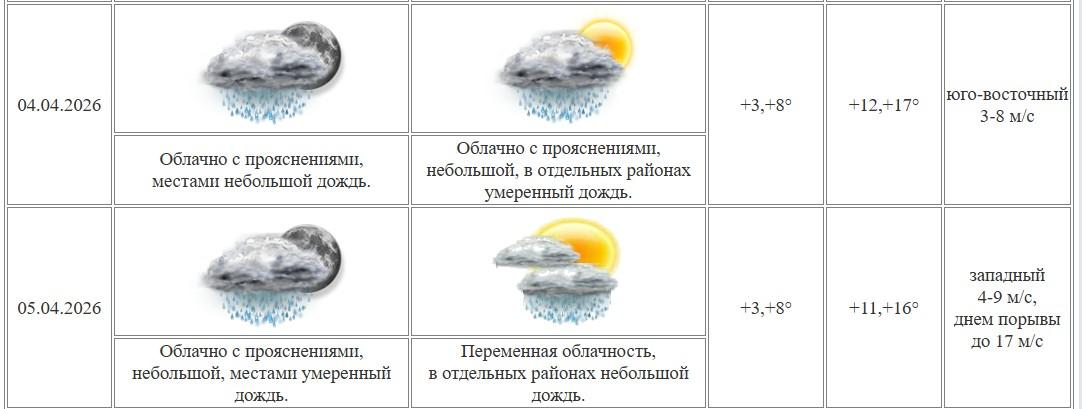 В ночь на субботу, 4 апреля, столбики термометров в регионе покажут от +3 до +8 градусов. Днем температура поднимется до +12…+17 градусов. Ветер будет юго-восточным, его скорость составит 3-8 метров в секунду.