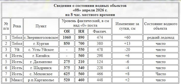 На реке Исеть в Катайске зафиксирован рост на 6 сантиметров, а в селе Мехонское — на 8 сантиметров. В то же время в Далматово уровень снизился на 6 сантиметров, а в Шадринске — на 4 сантиметра. В Каргаполье река Миасс прибавила за сутки 2 сантиметра.