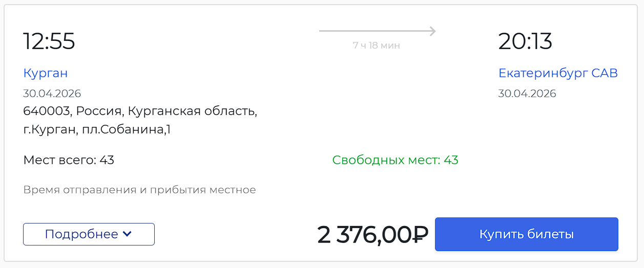 Для сравнения: автобусный билет по тому же маршруту на 30 апреля стоит 2376 рублей. Согласно информации сайта курганского автовокзала, в праздничные дни цена не меняется.